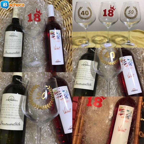 Vendo in scatole originali o in cesti in vimini, confezioni di vino + calici vino con anni per festeggiare in modo elegante il compleanno Un idea originale per una ricorrenza importante, un regalo per il papà, per un amico, per un giorno da ricordare Confezioni a partire da € 35 spese di spedizione comprese in tutta Italia Tel 3200135813