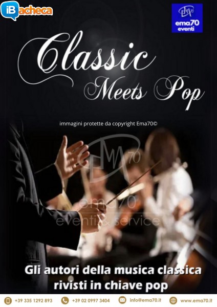 Gli autori della musica classica rivisti in chiave pop uno dei concerti tra i più originali di ema70 eventi, le più belle melodie della musica classica proposte in chiave pop, ma anche bellissimi brani pop divenuti un classico…insomma, un concerto assolutamente da non perdere! quando la musica classica incontra il pop…il risultato è sorprendente!!