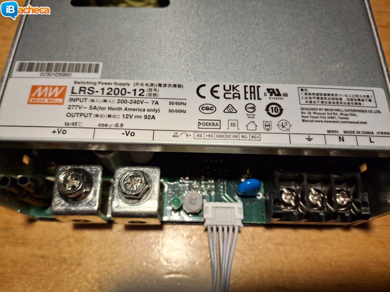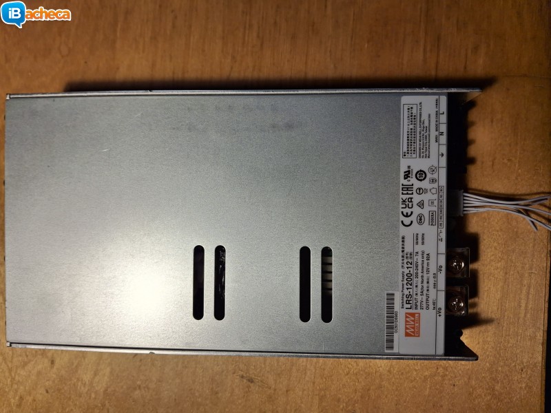 Alimentatore switching Mean Well modello LRS-1200-12- Tensione di uscita regolabile: 12-15v- Picco Corrente massima per 5 secondi: 138A 1650w- Corrente massima 92A- Potenza massima: 1200W- Efficienza 91%- Protezioni sovraccarico, sovratensione, temperaturaIn garanzia Comprato a dicembre 2025 Vendo per inutilizzo perché non mi serve piu